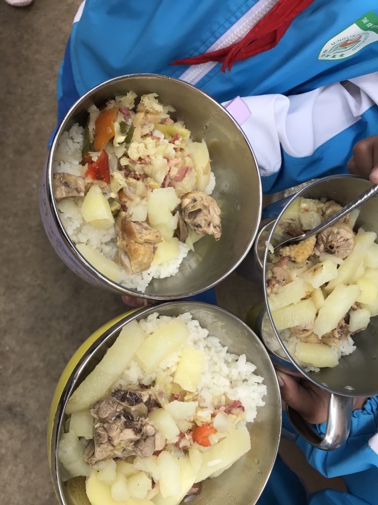 10:50孩子们下课准备吃早餐,他们还是一天只能吃两顿饭,早餐11:00,晚餐17:00。学生们每个班有值日生,去食堂把饭、菜端到教室楼下,按班摆放,低年级的是老师协助打菜,高年级都是学生负责打饭打菜。孩子们端着自己的小饭盆,站在教学楼下的空地上,三五成群嬉笑玩闹地吃着他们的午餐。凑过去看他们的菜,也和2010年第一次来有些不同。当时孩子们每餐的菜都是酸菜煮土豆,一个月才有一次是花生或豆腐偶有肉。今天孩子们的碗里是土豆和三几块鸡,问孩子们说一周有两次会是这样的菜,其他时间会有花生或豆腐。孩子们围聚过来,问了我很多问题,和良桥怎么认识的,为什么不是一个大学,为什么选的医学院、人民大学……和孩子们沟通,了解他们7:00起床,洗漱打扫宿舍后到教室早自习(读语文、数学,英语四年级才有)然后上课,早餐,完后打扫卫生,12:00上下午的课,16:30放学,走读的回家,住校的17:00晚餐,回教室做作业,高年级的有晚自习。21:00住校同学就寝。每天的运动是做课间操,学校没有体育老师,他们的体育课是数学老师上。
