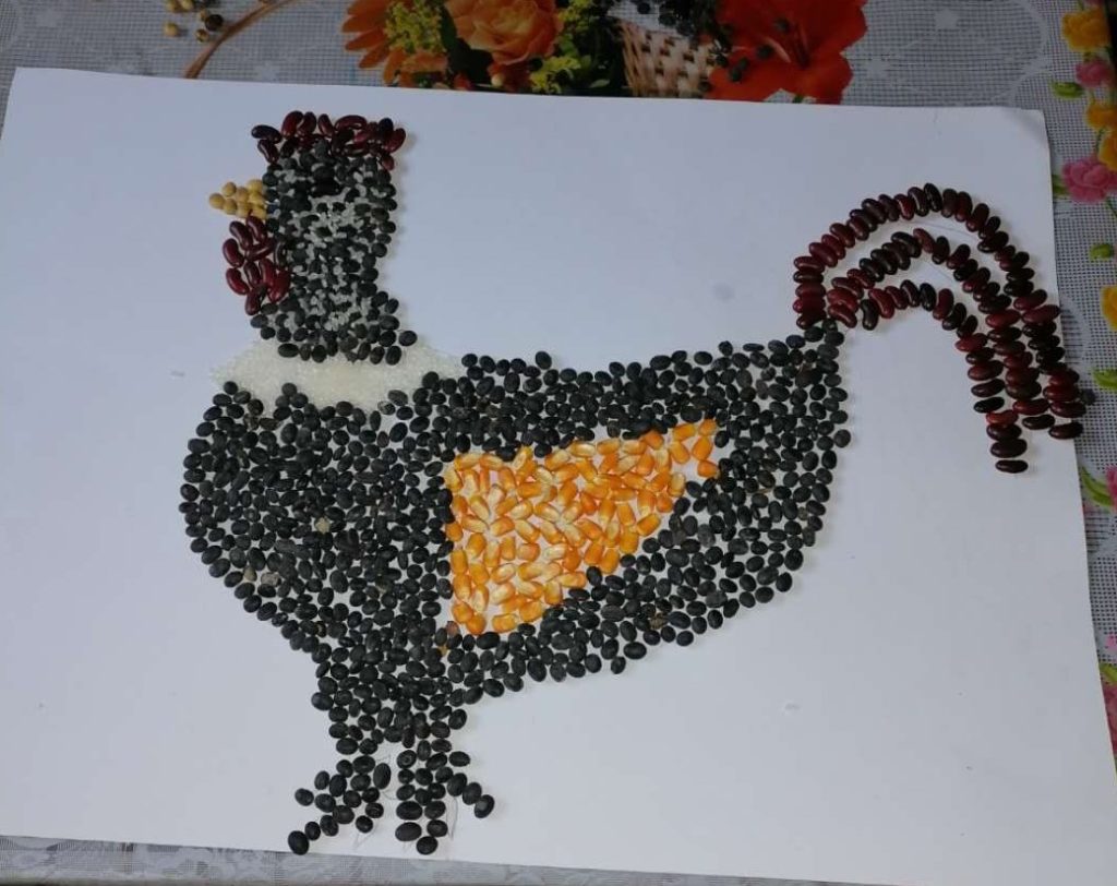 小朋友们想象力非常丰富,善于想办法,利用身边现有的素材,例如玉米,瓜子,绿豆。。。每一只公鸡都栩栩如生,比老师做的还棒!为你们骄傲!